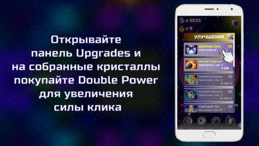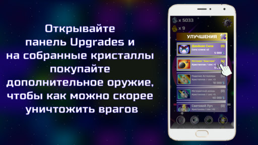 — На собранные кристаллы открывайте панель с апгрейдами и покупайте Double Power для увеличения силы клика, а также дополнительное оружие, чтобы как можно скорее уничтожить врагов: вражеских космических пришельцев, инопланетян и астероидов.