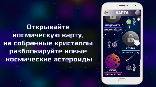 — Открывайте космическую карту, на собранные кристаллы разблокируйте новые космические астероиды и планеты.